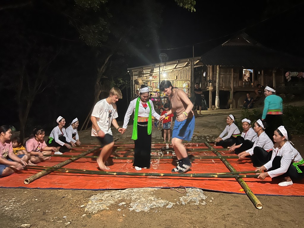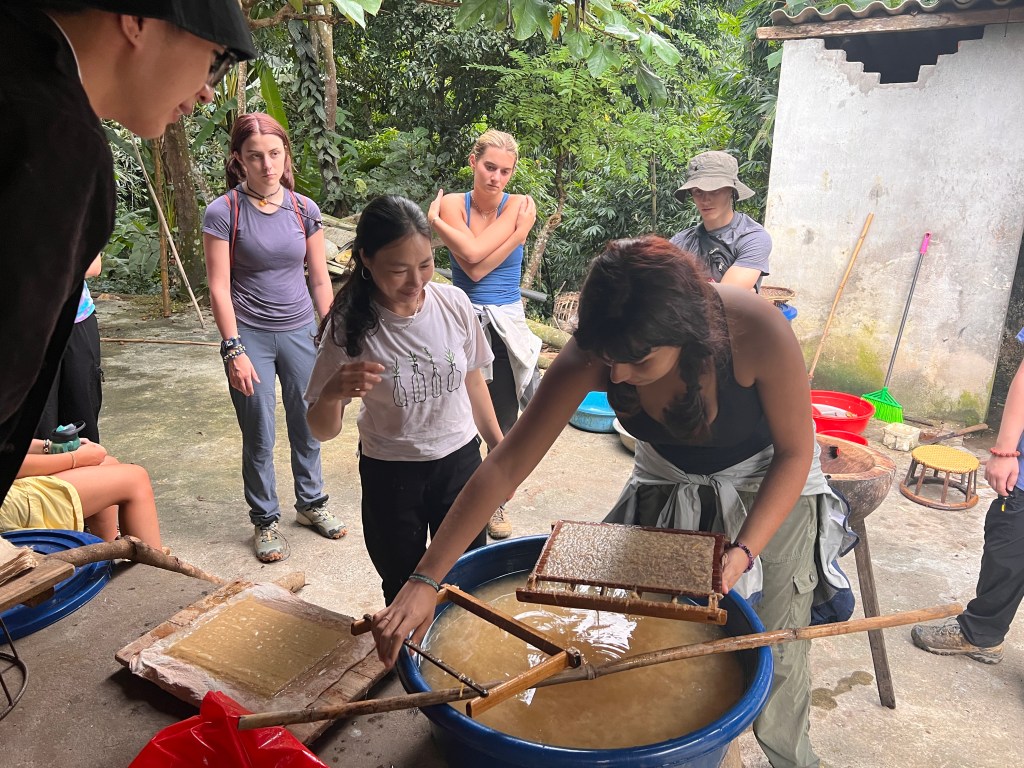 In practice, this meant a mix of cultural education activities as well as a very short stint of manual labor during our stay in Da Bac. We went for a hike through the mountain outside the Sung Village where we learned about local plants used for traditional medicine and cooking, stopped by a huge cave where local residents waited out bombing strikes during the Vietnam War, and enjoyed the fresh air and greenery of the forested hills. Various community members invited us into their homes in the village, where they demonstrated and taught us about the processes of making paper, rice wine, sour meat, and the traditional clothing and textiles of the Dao Tien people. In Mo Hem Village, which is situated along the bakes of Lake Hoa Binh, we joined local fisherwomen in their boats to check their traps for shrimp and fish, swam in the warm and beautiful lake, watched and participated in local dancing with bamboo rods, and got to try our hands at bamboo basket weaving.
